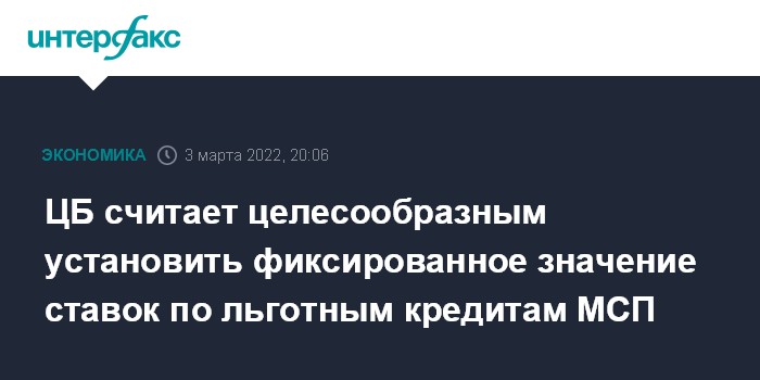 Москва. 3 марта. INTERFAX.RU - Банк России считает целесообразным в текущих условиях "отвязать" ставки по льготным программам кредитования МСП от ключевой и установить их фиксированные значения, говорится в посте регулятора в разделе "вопросы и ответы" на его сайте.