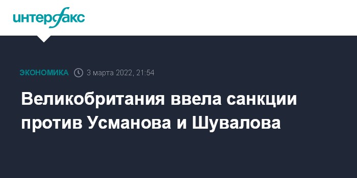 "Сегодня правительство объявило, что ввело полную заморозку активов и запрет на поездки в отношении Алишера Усманова и Игоря Шувалова, двух ведущих российских олигархов с существенными интересами в Великобритании и тесными связями с Кремлем", - говорится в заявлении на сайте британского правительства.