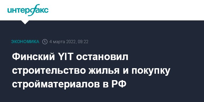 Кроме того, девелопер прекращает закупку лесоматериалов в РФ. "YIT решил больше не импортировать строительные материалы из России. Хотя эти закупки можно заменить альтернативными материалами и источниками, по оценкам YIT, кризис повлияет на цены на некоторые строительные материалы во всем мире", - говорится в сообщении.