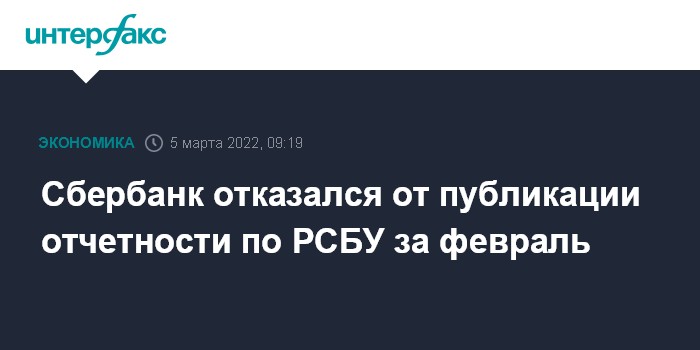 Москва. 5 марта. INTERFAX.RU - Сбербанк решил 5 марта не публиковать финансовую отчетность по РСБУ за февраль 2022 года, сообщили в пресс-службе кредитной организации.