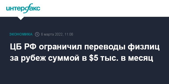 Москва. 6 марта. INTERFAX.RU - Банк России вводит ограничение в $5 тысяч в месяц на перевод за рубеж денежных средств физлицами - резидентами другим резидентам РФ, а также физлицами - нерезидентам, в том числе родственникам. Соответствующее предписание он дает уполномоченным банкам в связи с повышенной волатильностью на валютном рынке.