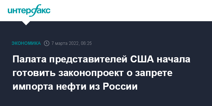 Москва. 7 марта. INTERFAX.RU - Палата представителей США изучает возможность разработки законопроекта о запрете импорта российской нефти.