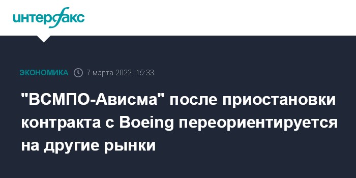 Москва. 7 марта. INTERFAX.RU - Российский поставщик титана - ПАО "Корпорация "ВСМПО-Ависма" - подтвердил приостановку контакта с концерном Boeing.
