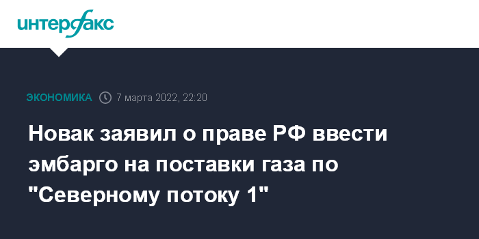 Москва. 7 марта. INTERFAX.RU - Россия имеет полное право принять "зеркальное" решение и ввести эмбарго на прокачку газа через газопровод "Северный поток 1", который сегодня загружен на максимальном уровне, но пока такое решение не принято, заявил вице-премьер РФ Александр Новак.