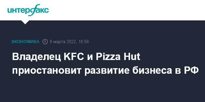 Москва. 8 марта. INTERFAX.RU - Yum! Brands Inc., владеющая брендом KFC и др., приостанавливает инвестиции и развитие ресторанной сети в России. Об этом сообщается в пресс-релизе компании.