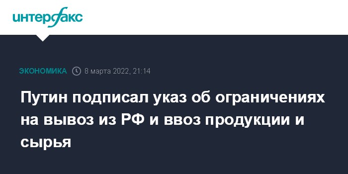 Путин подписал указ об ограничениях на вывоз из РФ и ввоз продукции и сырья
