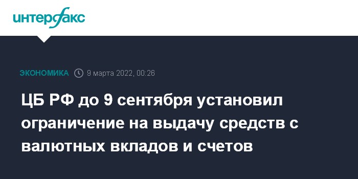 ЦБ РФ до 9 сентября установил ограничение на выдачу средств с валютных вкладов и счетов