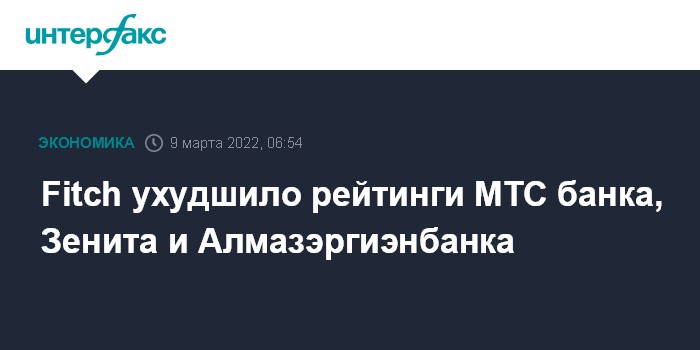 Москва. 9 марта. INTERFAX.RU - Международное рейтинговое агентство Fitch Ratings снизило долгосрочные рейтинги дефолта эмитента МТС банка, банка "Зенит" и Алмазэргиэнбанка до "В" и рейтинги устойчивости до "b".