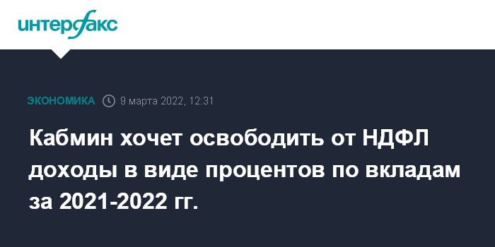 Москва. 9 марта. INTERFAX.RU - Правительство РФ на заседании 9 марта рассмотрит проект поправок в Налоговый кодекс, которым, в частности, предлагается освободить от НДФЛ доходы физлиц в виде процентов, полученных в 2021 и 2022 годах по вкладам (остаткам на счетах) в банках, сообщил источник "Интерфакса", знакомый с материалами к заседанию кабмина.