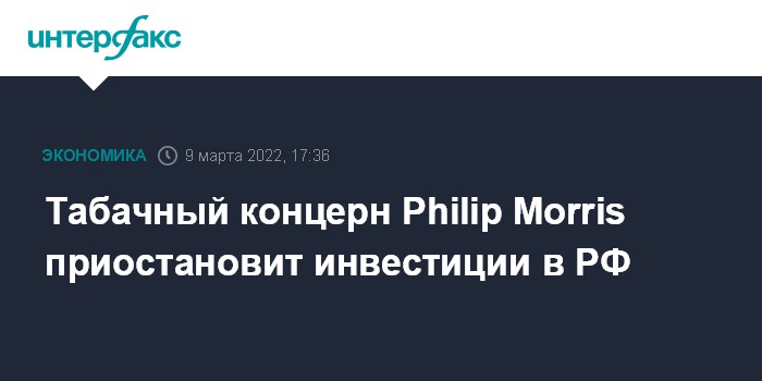 Москва. 9 марта. INTERFAX.RU - Табачный концерн Philip Morris International Inc. (PMI) приостанавливает запланированные инвестиции в РФ, включая запуск новых продуктов, инвестиции в инновации, коммерческую и производственную деятельность.
