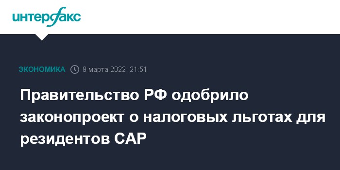 Правительство РФ одобрило законопроект о налоговых льготах для резидентов САР