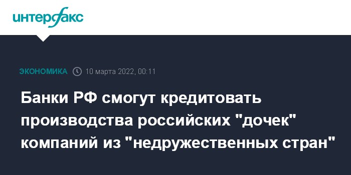 Москва. 10 марта. INTERFAX.RU - Подкомиссия правкомиссии по контролю за иностранными инвестициями в РФ приняла решение разрешить российским кредитным организациям кредитовать производства российских "дочек" компаний из "недружественных стран".