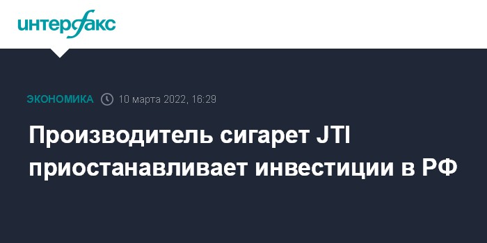 Москва. 10 марта. INTERFAX.RU - Japan Tobacco International (JTI), крупный мировой производитель табачных изделий, приостанавливает новые инвестиции и маркетинговую деятельность в России, а также запуск новых продуктов, сообщает пресс-служба компании.