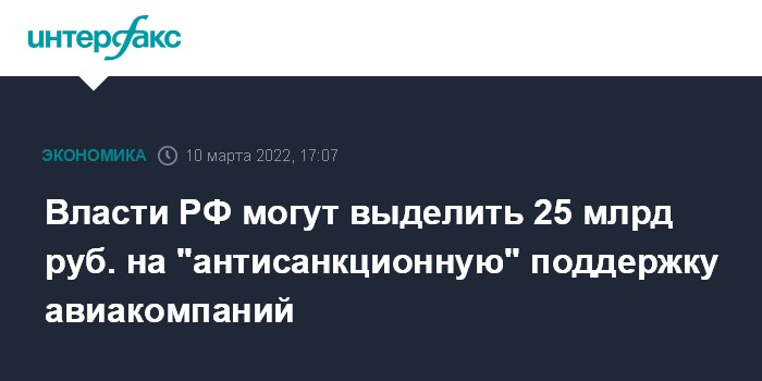 Москва. 10 марта. INTERFAX.RU - Власти РФ на фоне введения западных санкций обсуждают выделение из федерального бюджета 25 млрд рублей на поддержку авиакомпаний, сообщил "Интерфаксу" источник в финансово-экономическом блоке правительства.