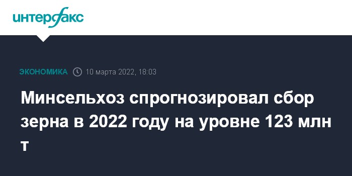 Москва. 10 марта. INTERFAX.RU - Сбор зерна в РФ в этом году может составить около 123 млн тонн, сообщил министр сельского хозяйства РФ Дмитрий Патрушев на совещании президента с членами правительства в четверг.