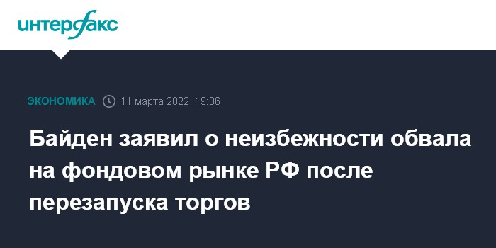 Москва. 11 марта. INTERFAX.RU - Президент США Джо Байден присоединился к мнению тех экспертов, которые считают неизбежным существенное падение стоимости активов в момент перезапуска торгов на фондовом рынке "Московской биржи", закрытом с конца февраля.