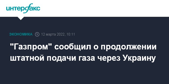 "Газпром" осуществляет подачу российского газа для транзита через территорию Украины в штатном режиме, в соответствии с заявками европейских потребителей - 109,5 млн куб. м на 12 марта", - сообщил журналистам официальный представитель компании Сергей Куприянов.