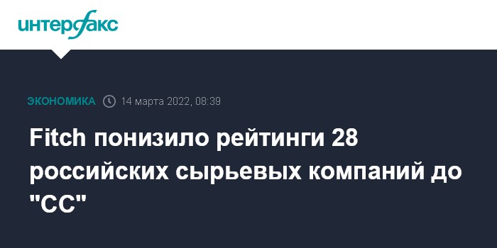 Москва. 14 марта. INTERFAX.RU - Международное рейтинговое агентство Fitch понизило долгосрочные рейтинги дефолта эмитента в иностранной валюте 28 российских сырьевых компаний до "CC".
