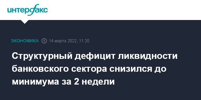 Москва. 14 марта. INTERFAX.RU - Структурный дефицит ликвидности банковского сектора по операциям с ЦБ РФ на начало дня 14 марта снизился до 3 трлн 849,4 млрд рублей, это минимальный уровень после 25 февраля, когда он составлял 3 трлн 206,6 млрд рублей, следует из информации на сайте ЦБ РФ.