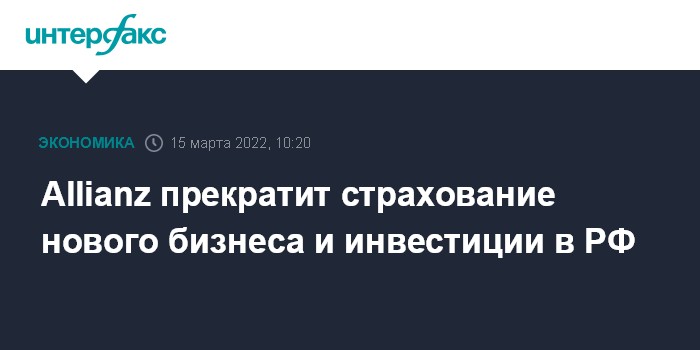 Москва. 15 марта. INTERFAX.RU - Германская страховая компания Allianz SE прекратит страхование нового бизнеса и не будет осуществлять новые инвестиции в России, говорится в сообщении компании.