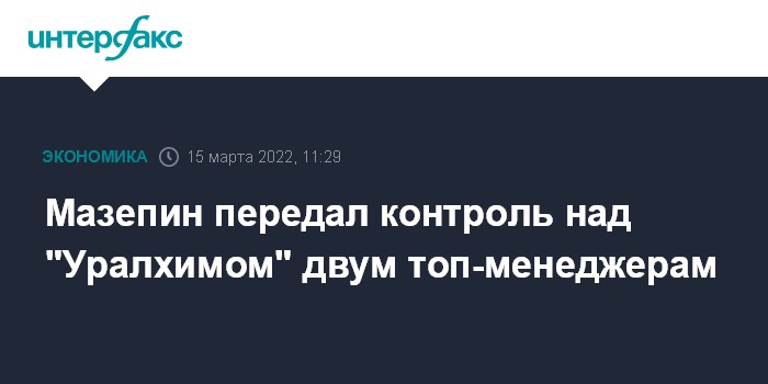 Москва. 15 марта. INTERFAX.RU - Дмитрий Мазепин, на прошлой неделе попавший под санкции Евросоюза, передал контроль над группой "Уралхим" своим давним соратникам - председателю совета директоров компании Димитрию Татьянину и генеральному директору Дмитрию Коняеву.