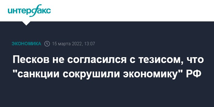 Москва. 15 марта. INTERFAX.RU - Пресс-секретарь президента РФ Дмитрий Песков заявил, что экономика России столкнулась с трудностями из-за санкций, но речи о том, что это привело к ее краху, нет - в ситуации можно найти плюсы.