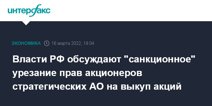 Власти РФ обсуждают "санкционное" урезание прав акционеров стратегических АО на выкуп акций