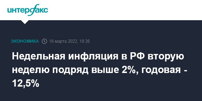 Из этих данных следует, что годовая инфляция в РФ на 11 марта ускорилась до 12,5% (максимума с декабря 2015 года) с 10,4% на 4 марта, 9,15% на конец февраля, 8,73% на конец января и 8,39% на конец декабря.