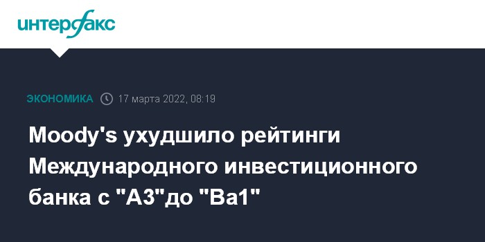 Москва. 17 марта. INTERFAX.RU - Агентство Moody's Investors Service снизило долгосрочный рейтинг эмитента и рейтинг приоритетных необеспеченных обязательств Международного инвестиционного банка (МИБ) до "Ba1" с "A3". Рейтинг поставлен на пересмотр с возможностью дальнейшего ухудшения.