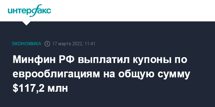 "Минфин России информирует, что платежное поручение о выплатах купонного дохода по облигациям внешних облигационных займов РФ со сроком погашения в 2023 году и 2043 году в общей сумме $117,2 млн сроком 15 марта 2022 года, направленное иностранному банку-корреспонденту 14 марта 2022 года, исполнено", - говорится в сообщении министерства.