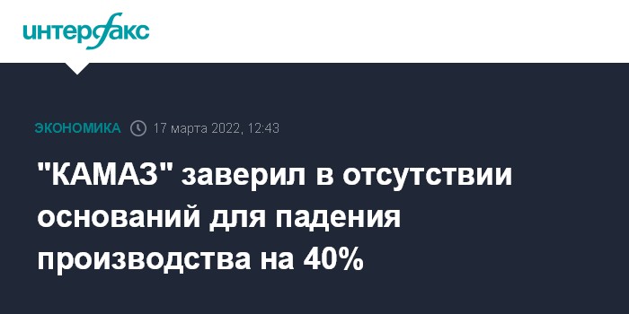 Москва. 17 марта. INTERFAX.RU - Озвученный главой Татарстана Рустамом Миннихановым прогноз возможного сокращения производства "КАМАЗа" на 40% с отправкой в простой до 15 тысяч сотрудников является худшим из сценариев, ситуация от этого пока далека, сообщила корпоративная газета "Вести КАМАЗа" со ссылкой на главу пресс-службы автопроизводителя Олега Афанасьева.