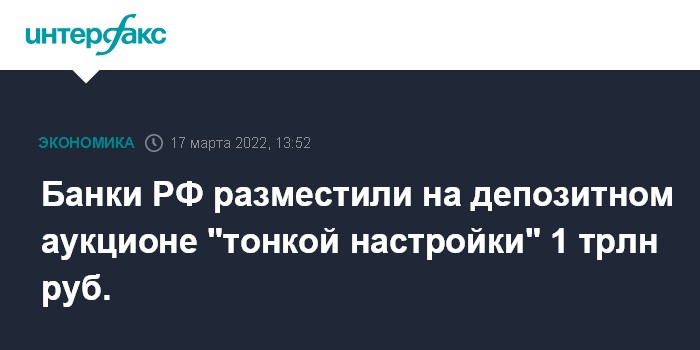 ЦБ с 3 марта проводит ежедневно по рабочим дням депозитные аукционы в рамках "тонкой настройки" с лимитами 3 трлн рублей, с 16 марта лимит снижен до 1 трлн рублей.