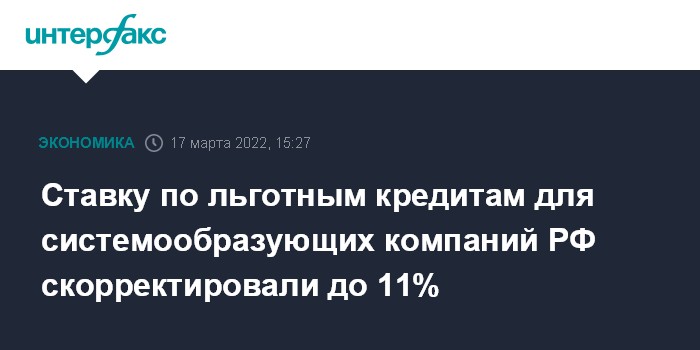 Ставку по льготным кредитам для системообразующих компаний РФ скорректировали до 11%