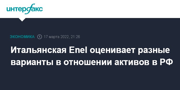 Москва. 17 марта. INTERFAX.RU - Итальянская энергокомпания Enel рассматривает в отношении активов в России все возможные варианты, которые сейчас доступны компании в условиях санкционных ограничений, рассказал в ходе телефонной конференции с инвесторами CEO компании Франческо Стараче.