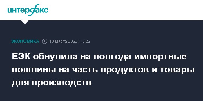 Москва. 18 марта. INTERFAX.RU - Совет Евразийской экономической комиссии (ЕЭК) принял решение освободить на шесть месяцев от ввозной таможенной пошлины продовольствие и товары, используемые в их производстве.