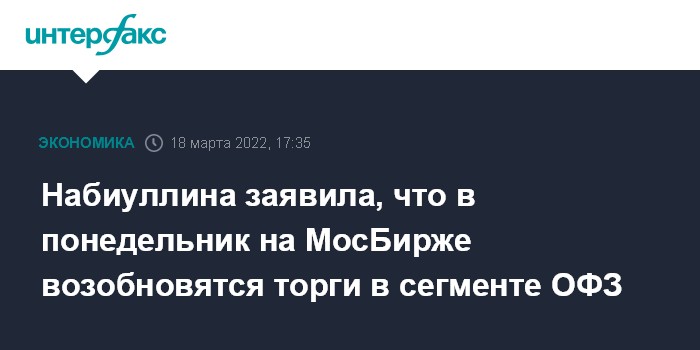 Москва. 18 марта. INTERFAX.RU - В понедельник, 21 марта, на МосБирже возобновятся торги в сегменте облигаций федерального займа (ОФЗ), заявила председатель Банка России Эльвира Набиуллина во время выступления по итогам заседания совета директоров ЦБ.