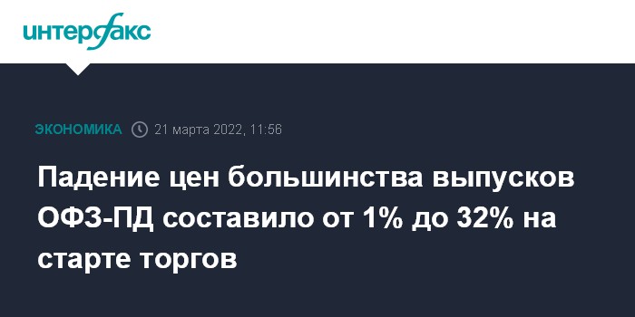Москва. 21 марта. INTERFAX.RU - Падение цен большинства выпусков ОФЗ-ПД составило от 1% до 32%, некоторые выпуски ОФЗ-ПК подорожали, свидетельствуют предварительные итоги аукциона открытия на рынке ОФЗ в понедельник.