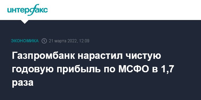Москва. 21 марта. INTERFAX.RU - Группа Газпромбанка (ГПБ) в 2021 году увеличила чистую прибыль по МСФО в 1,7 раза - до 95,8 млрд рублей по сравнению с 56,0 млрд рублей прибыли в 2020 году, следует из отчета кредитной организации.
