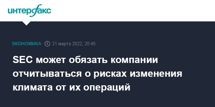Москва. 21 марта. INTERFAX.RU - Комиссия по ценным бумагам и биржам (SEC) США в понедельник проведет голосование по поводу новых правил, которые обяжут публичные компании отчитываться о рисках, связанных с изменением климата и выбросами парниковых газов от своих операций.