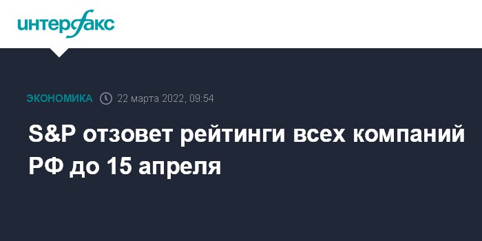 Москва. 22 марта. INTERFAX.RU - Международное рейтинговое агентство S&P Global Ratings отзовет кредитные рейтинги всех российских компаний и организаций, говорится в сообщении агентства.