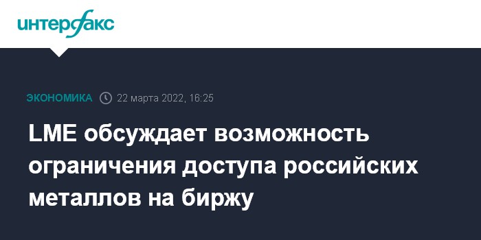 Москва. 22 марта. INTERFAX.RU - Лондонская биржа металлов (LME) обсуждает с государственными органами власти вопрос о возможном запрете на отгрузку российских металлов на склады биржи, заявил главный исполнительный директор LME Мэтью Чемберлен в интервью агентству Bloomberg.