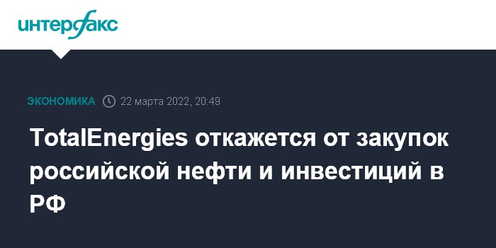 Москва. 22 марта. INTERFAX.RU - Французская TotalEnergies, один из крупнейших иностранных инвесторов в российском ТЭК, приняла решение об отказе от закупки российской нефти и нефтепродуктов, а также приостановке инвестиций в проект "Арктик СПГ 2".