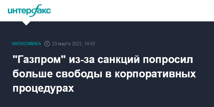 Москва. 23 марта. INTERFAX.RU - "Газпром" предлагает правительству РФ временно скорректировать нормы корпоративного управления в компаниях с участием государства для "оперативного решения задач по реструктуризации активов в условиях санкционного давления".