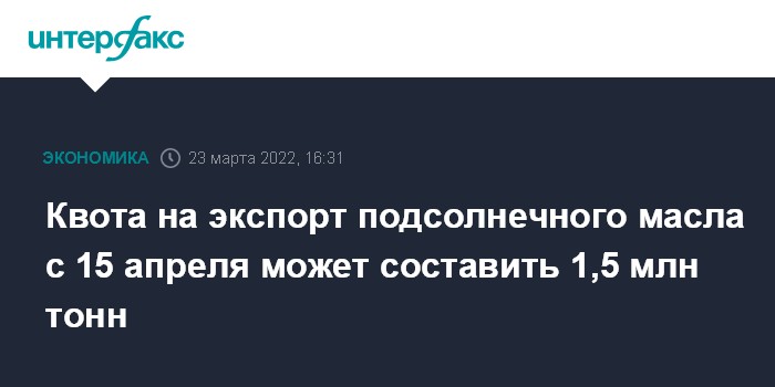 23 марта на совещании с участием президента Владимира Путина глава Минсельхоза Дмитрий Патрушев предложил ввести квоты на экспорт подсолнечного масла и шрота, чтобы сохранить стабильную ситуацию на рынке подсолнечного масла. Это предложение уже направлено в Минэкономразвития.