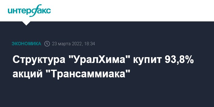 Москва. 23 марта. INTERFAX.RU - АО "Химактивинвест" (на 100% принадлежит БХК "УралХим") стало победителем аукциона по продаже 93,8317% акций ПАО "Трансаммиак" (управляет российской частью аммиакопровода Тольятти-Одесса), говорится в протоколе торгов.