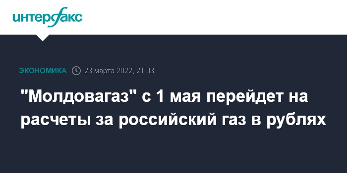 Москва. 23 марта. INTERFAX.RU - АО "Молдовагаз" с 1 мая перейдет на рубли в расчетах с "Газпромом", заявил журналистам председатель правления АО Вадим Чебан.