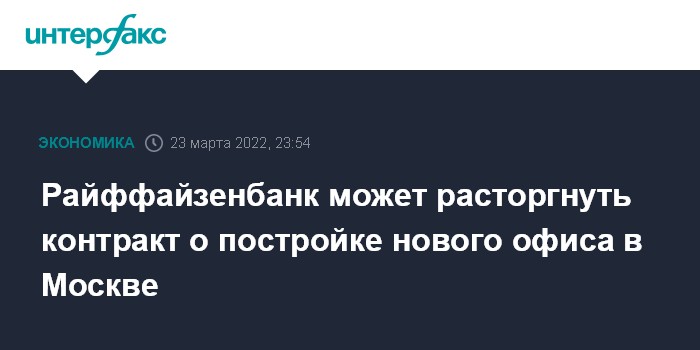 Москва. 23 марта. INTERFAX.RU - Наблюдательный совет Райффайзенбанка 24 марта рассмотрит вопрос о расторжении контракта с АО "Специализированный застройщик "Московский бизнес инкубатор" (входит в группу "Эталон") на строительство нового офисного здания для головного офиса, следует из сообщения кредитной организации.