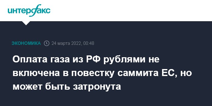 Москва. 24 марта. INTERFAX.RU - При подготовке саммита ЕС 24-25 марта вопрос оплаты российского газа в Европе за рубли не поднимался, но это не значит, что его не затронут в своих дискуссиях европейские лидеры, заявил журналистам высокопоставленный чиновник Евросоюза.