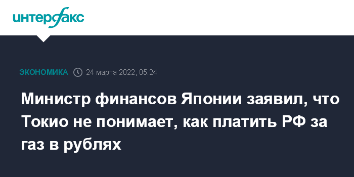 Москва. 24 марта. INTERFAX.RU - Япония пока не понимает, как будет выполняться требование России о введении платежей за газ в рублях при расчетах с недружественными странами, заявил японский министр финансов Сюнъити Судзуки.