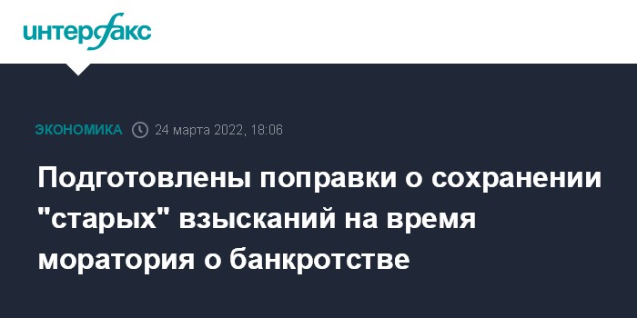Москва. 24 марта. INTERFAX.RU - Минэкономразвития подготовило законопроект, по которому до конца 2022 года в случае введения моратория на банкротства на время его действия не будут приостанавливаться исполнительные производства, возникшие до его объявления, рассказал источник "Интерфакса", знакомый с проектом.